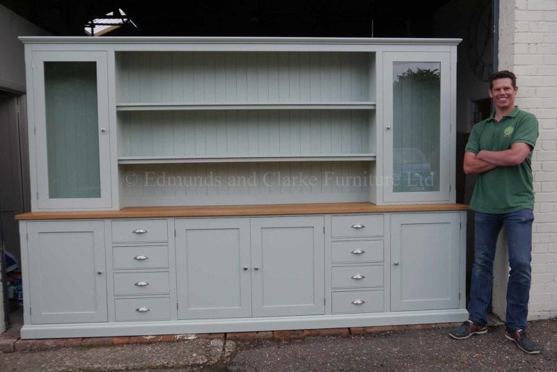 A cracking dresser made in two parts to fill an entire wall, spray painted in Farrow & Ball Mizzle with solid oiled oak top.