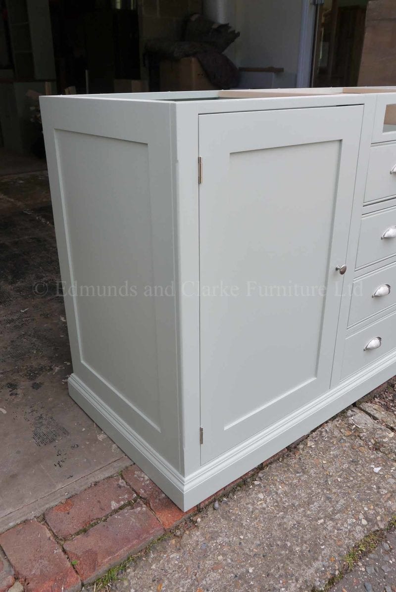 A cracking dresser made in two parts to fill an entire wall, spray painted in Farrow & Ball Mizzle with solid oiled oak top.