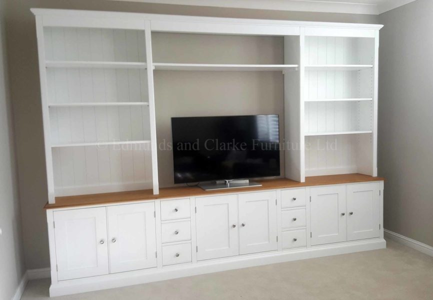 A lovely example of a recent commision, after collecting a brief and measuring up and discussing various options we came up with a bespoke Painted TV large wall unit solution useful design. Fitting along an entire wall with many storage ideas