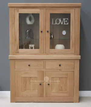 Our Hadleigh Oak Small Glazed Dresser with adjustable oak and glass shelving, dovetailed drawers, bevelled glass doors, and a light unit is the ideal choice for living rooms and corridors. For areas with more limited space, choose our Hadleigh Oak Hall / Console Table, which has two dovetailed drawers with an underlying shelf for extra storage. Consider also our Hadleigh Oak Large Sideboard, which has four drawers with adjustable oak shelving.