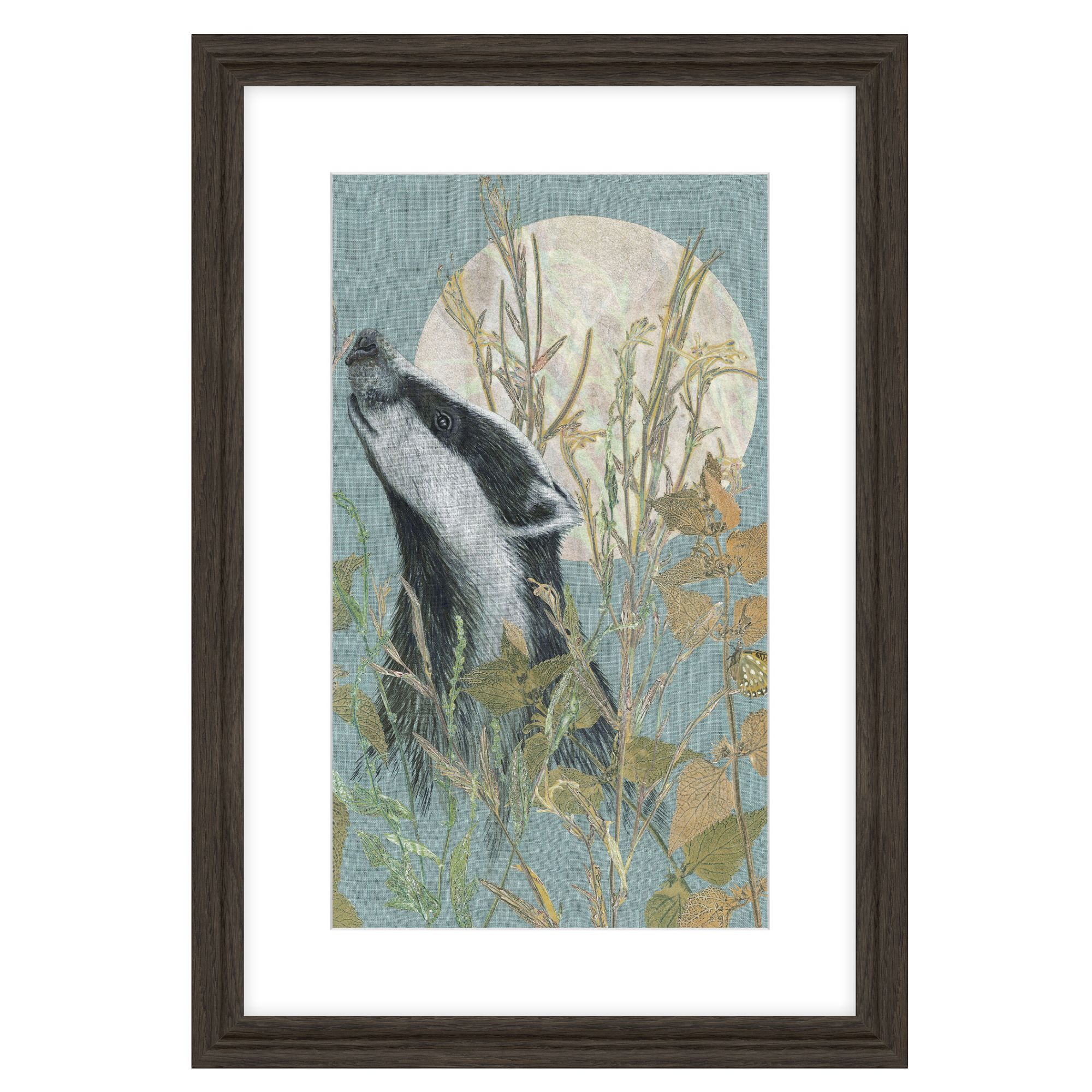 This exquisite piece captures the quiet wisdom of a badger in long grasses amidst delicate foliage, set against the soft, luminous glow of a full moon.