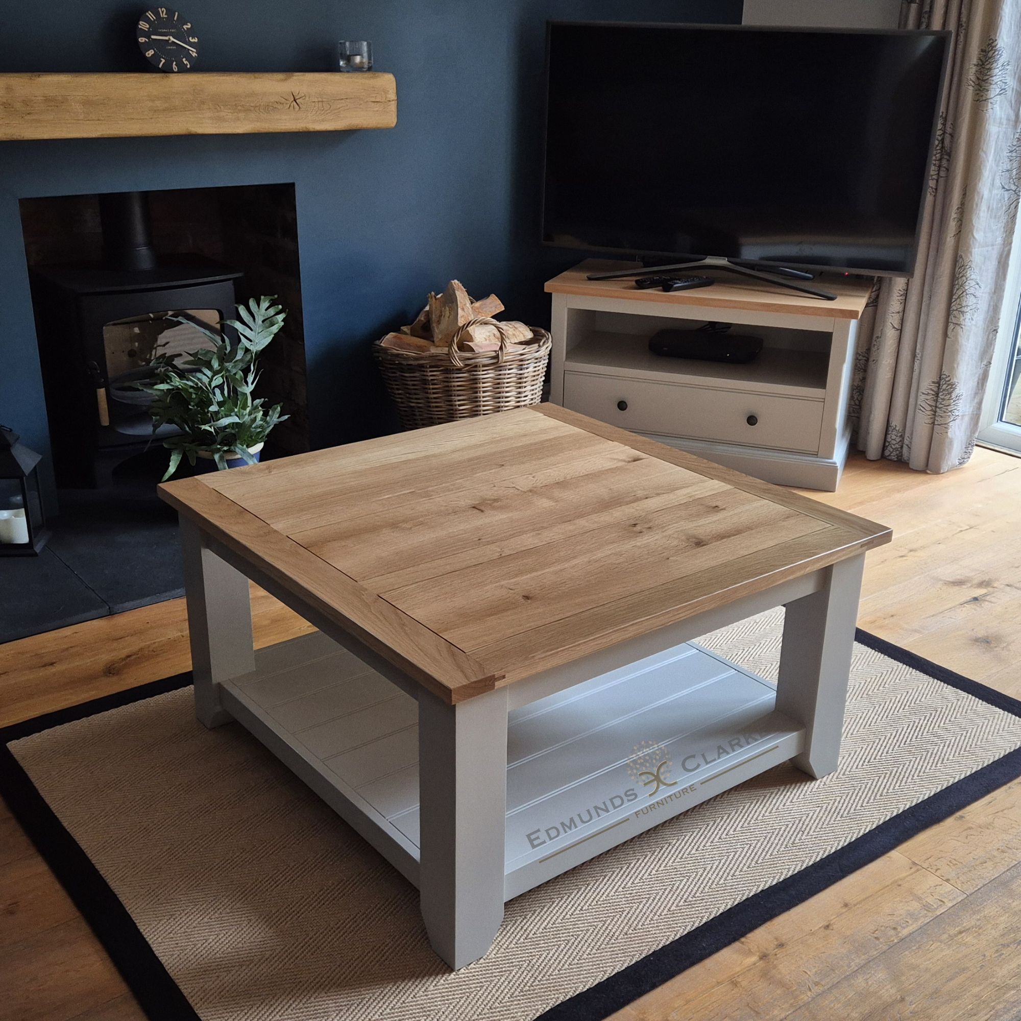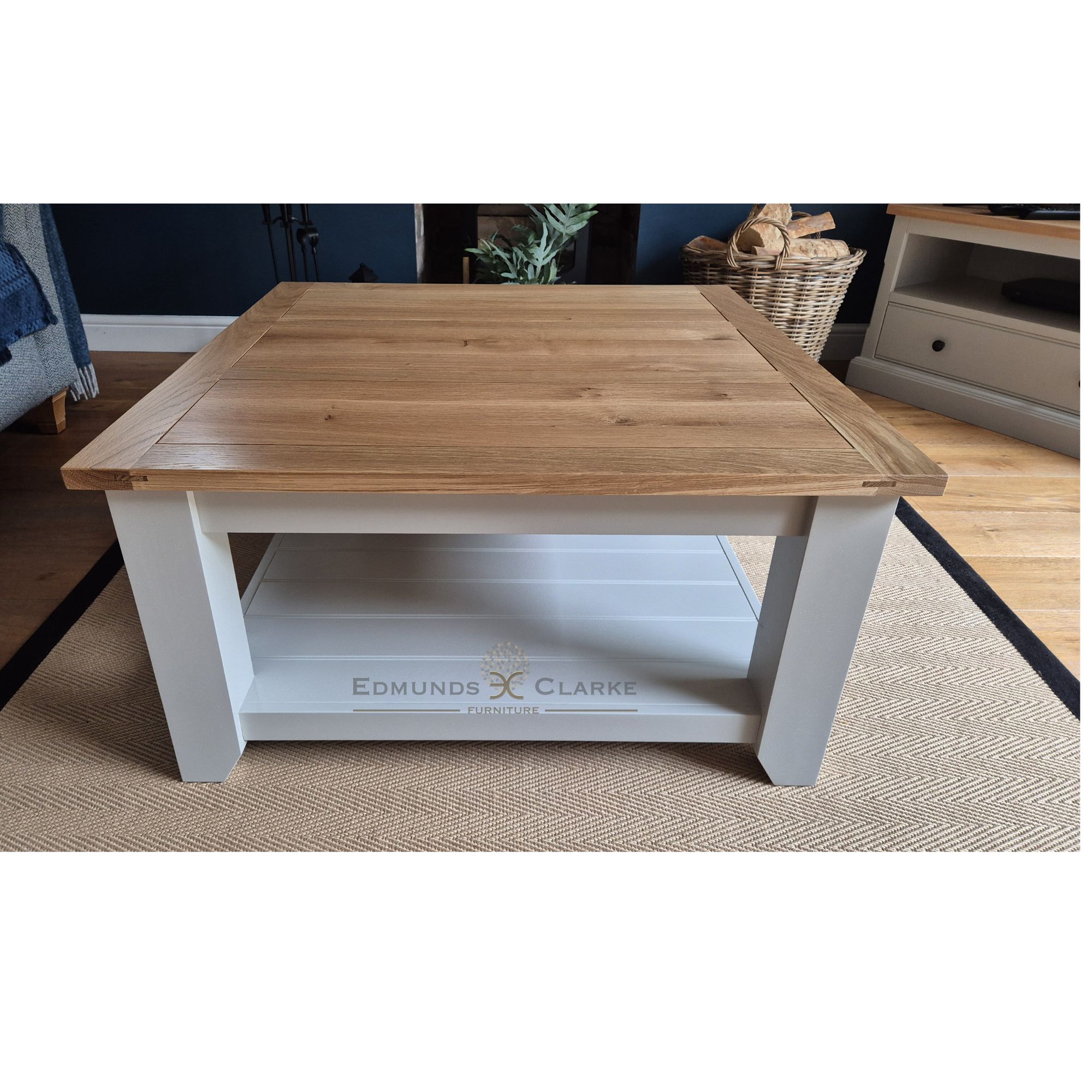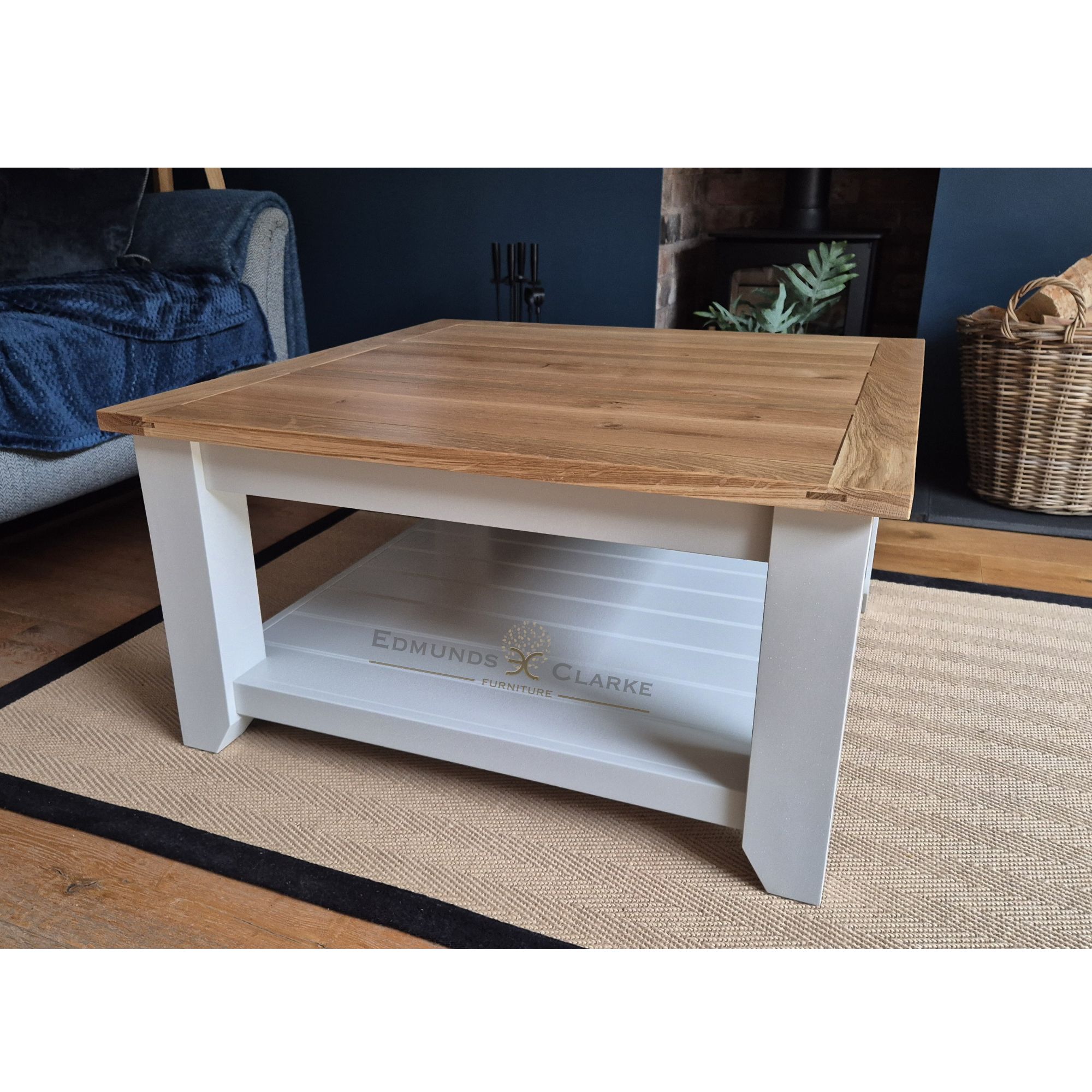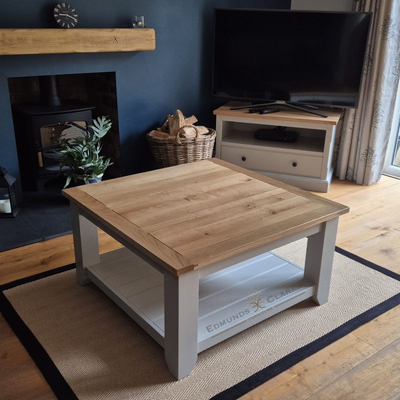 This lovely bespoke large coffee table has a lovely solid oak panelled top finished in a hard wearing clear Matt lacquer. Made specifically for a customer who needed a large square coffee table.