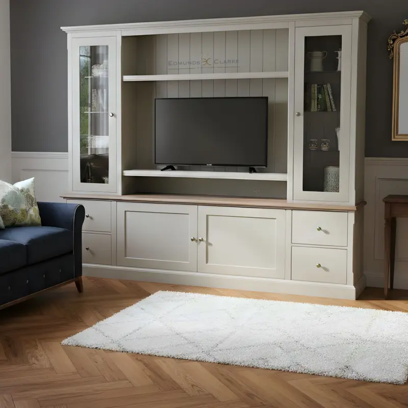 Our Edmunds TV Wall Display Unit is just for you. This stunning and versatile handmade unit has plenty of space – hide items out of sight, like those games, CD/DVD’s, magazines, books etc! You will never be short of storage with this super entertainment cabinet. Add the fact that it has 2 large glazed doors on the rack section and you have an absolute winner for displaying some beautiful ornaments (especially with our upgraded glass shelves and lighting pack!) It features central space for your TV and either a sound bar or media boxes and adjustable shelves all round.