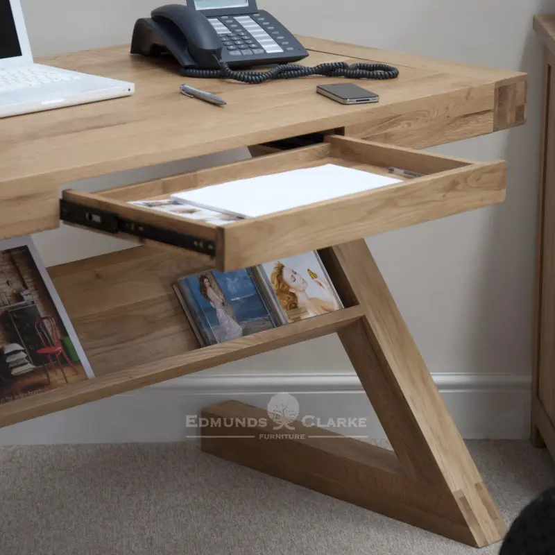 Our Z Designer solid oak Z desk with drawer and shelf features: