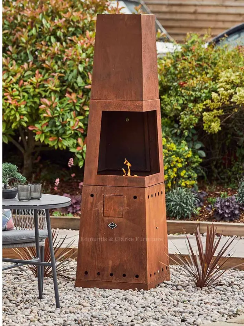 This Chiminea set provides heat well into the evening, a tall chimney directs the smoke upwards and avoids eye irritation. Made from Corten Steel, it is an excellent design and burning function.