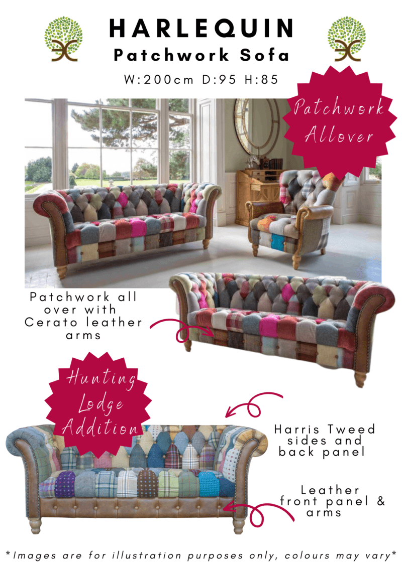 As standard our Harlequin patchwork sofa is a fast track item. Made beautifully with the finest of patchwork fabrics and Harris Tweed then characterised with aniline “Italian leather” on the arms.