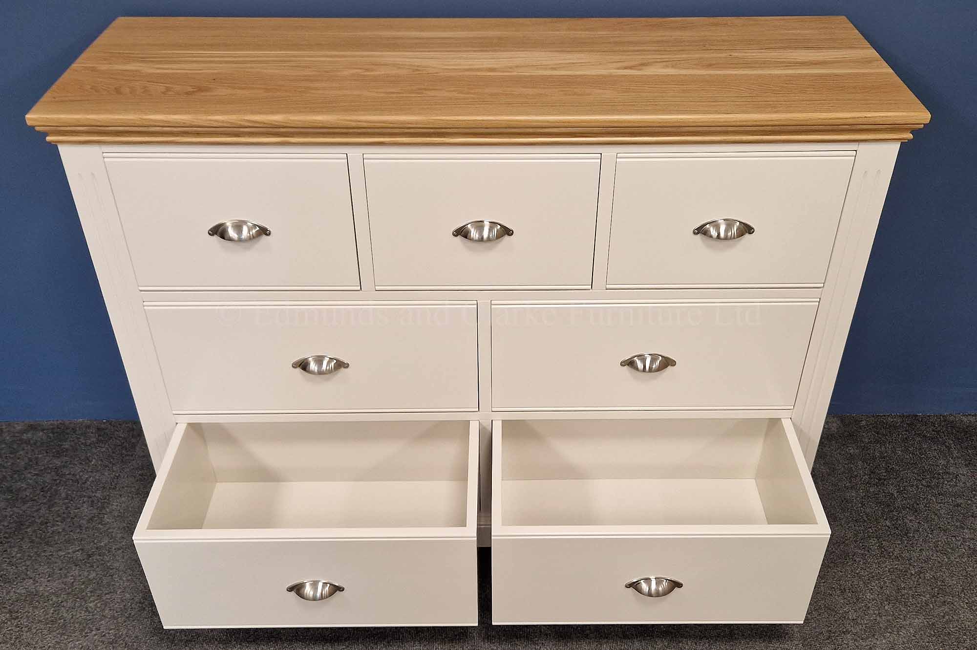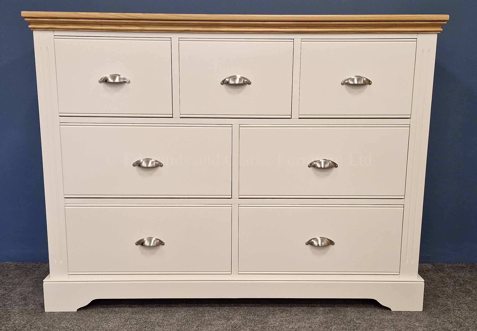 Beautifully made in Britain and using real craftmanship combined with the very best materials, our Clarke painted 7 drawer JUMPER multi-chest and all the other pieces have stunning plinths and top details.