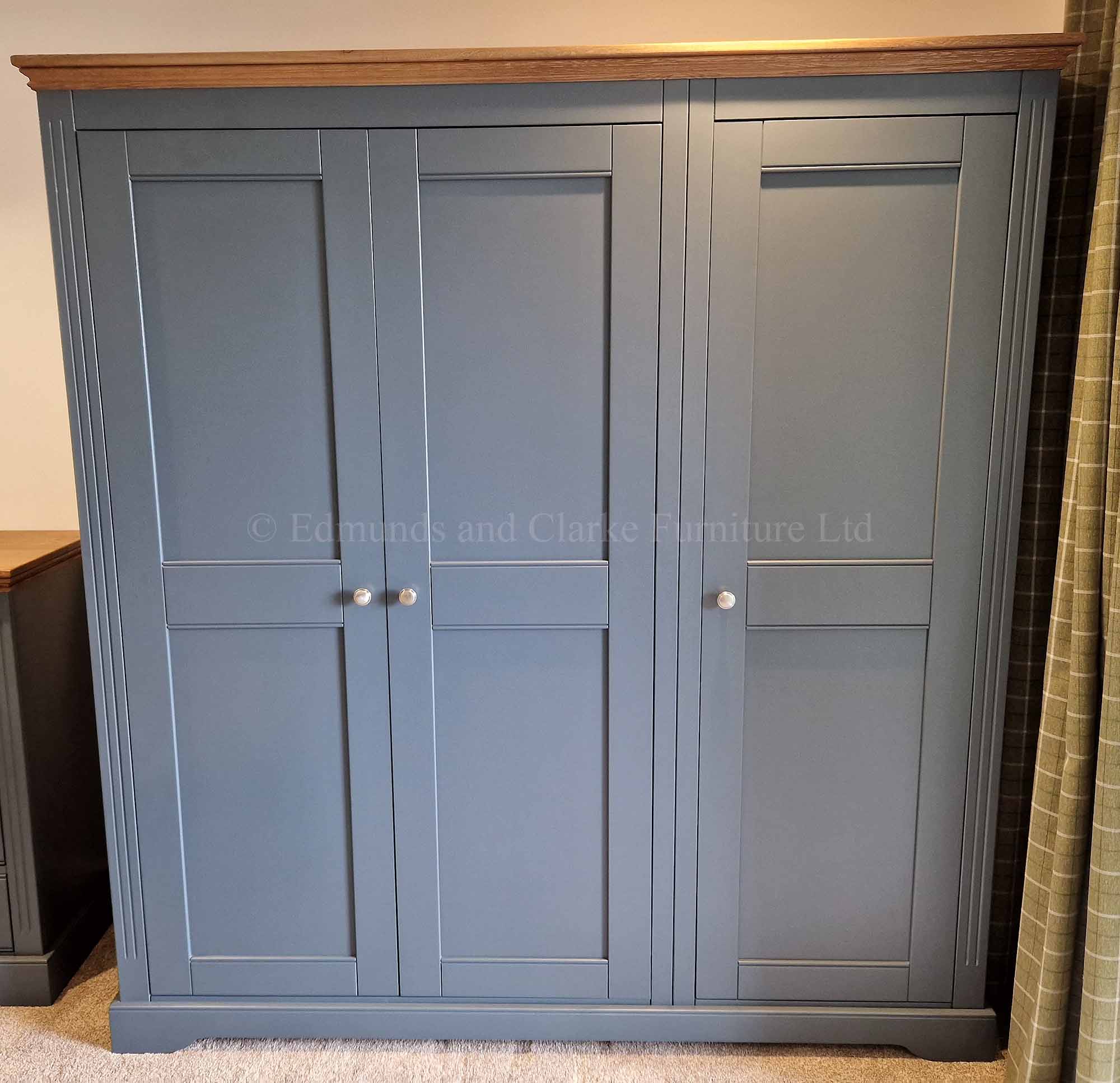 Beautifully made in Britain and using real craftmanship combined with the very best materials, our Clarke painted triple full length wardrobe and all the other pieces have stunning plinths and top details. Why not add extra storage with some shelving? (1 shelf would normally be fitted above the rail – if you choose more than 1 we will contact you for positioning)