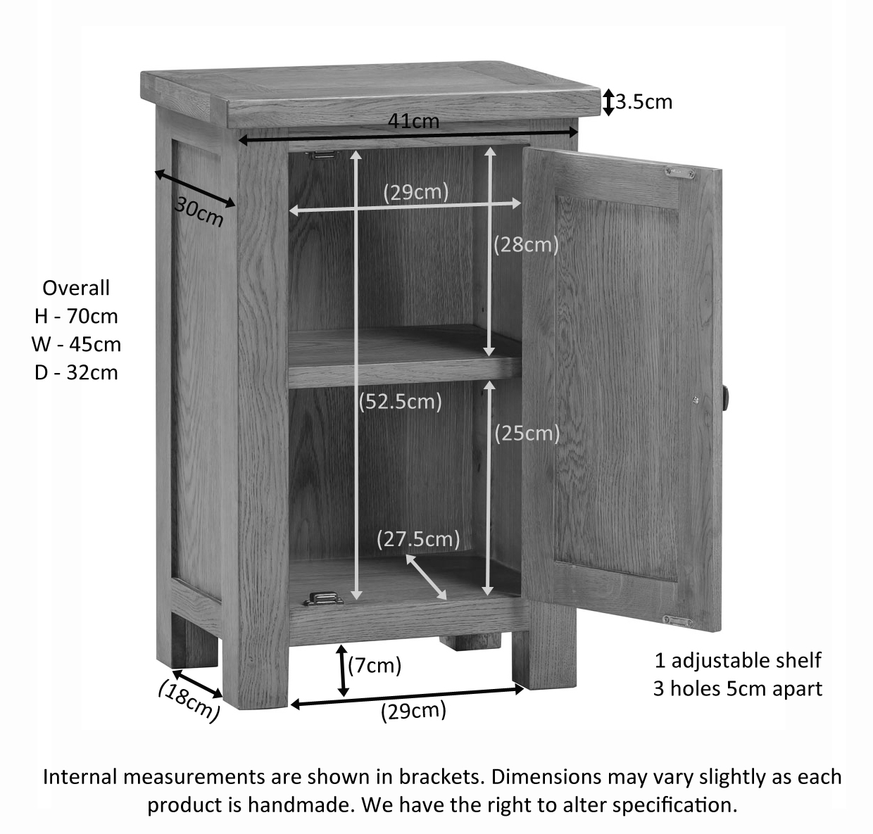 This small yet eye catching piece will bring a contemporary style to your home. It boasts clean straight lines and although it is small it offers plenty of storage space. Offering one adjustable shelf inside.