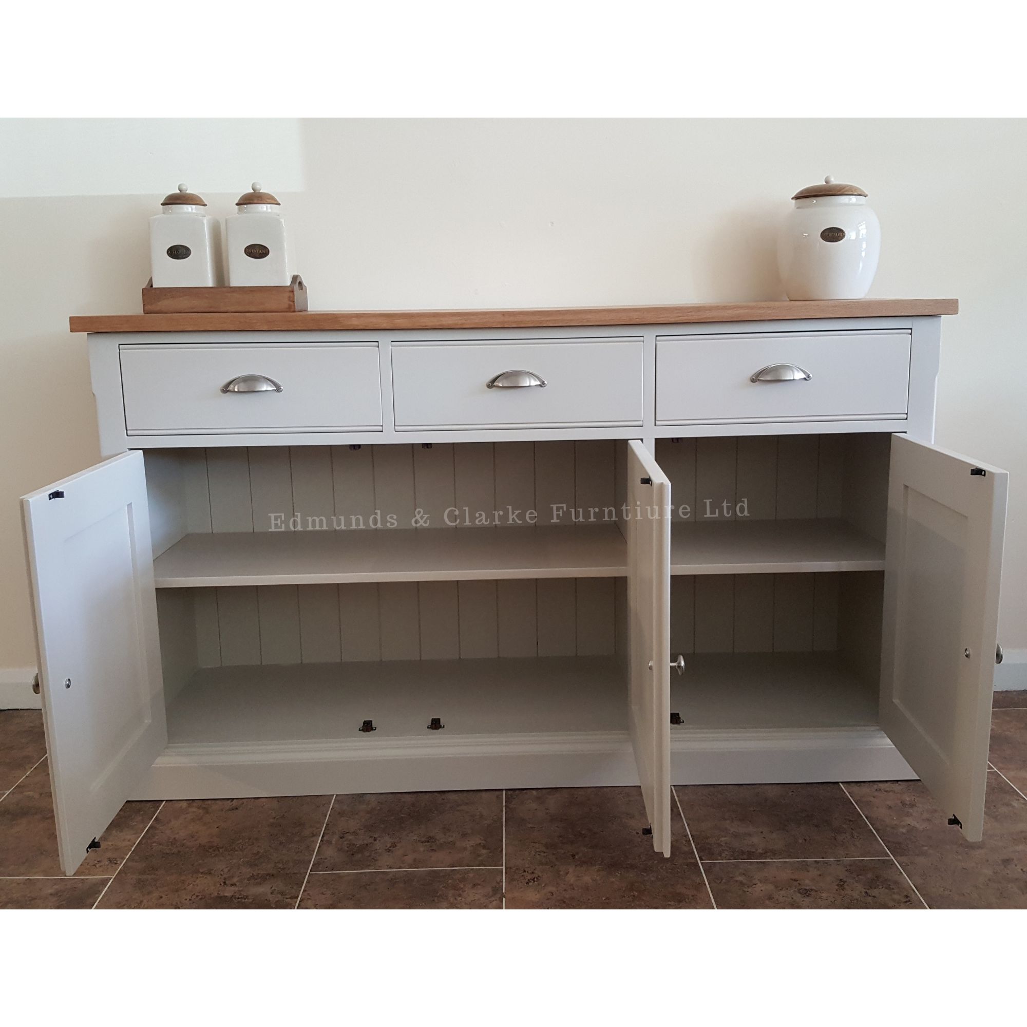 Each piece features 2x adjustable shelves throughout the cupboards.  With our in-house Edmunds design, there is no need for a central divider between the pair of shaker style doors, which allows access for larger items – perfect for hiding those extra bulky items!  Then there is the addition of the single cupboard section giving even more storage flexibility.