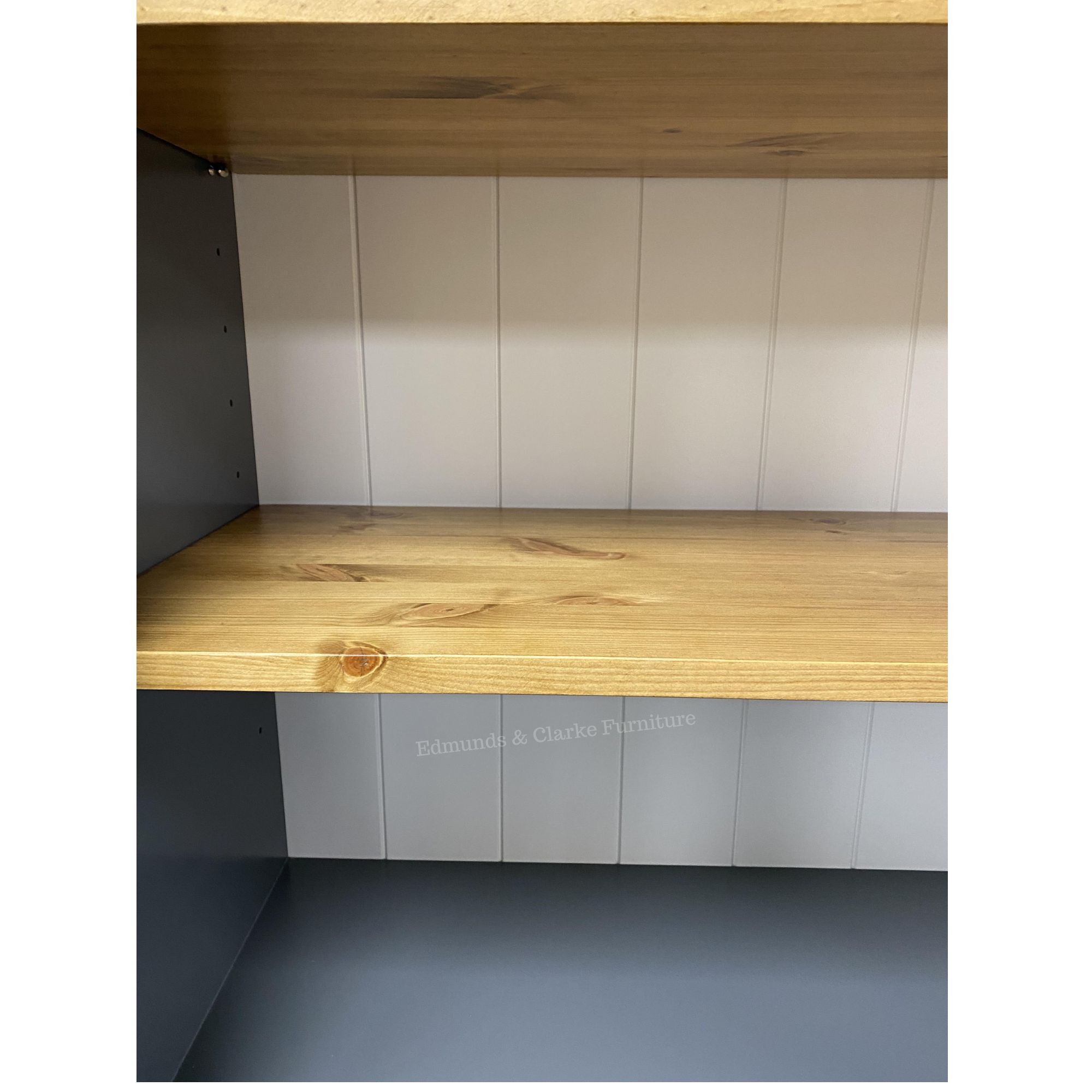 As standard we offer the shelves in two finishes – painted allover to match the main unit, or light oak stained waxed pine to either match a complete wood unit or feature as a nice contrast to the painted outer. If you require solid oak shelves in any of our standard oak finishes then please get in touch for a competitive quotation.