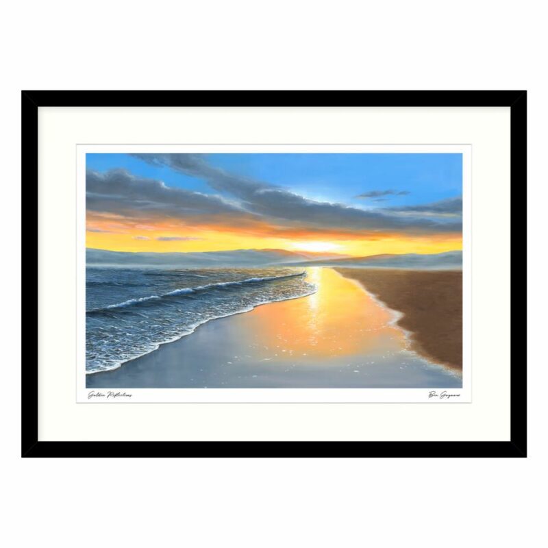“Golden Reflections” framed art captures a magical coastal scene. Beautiful waves on golden sands. Framed in a black frame by Ben Goymour.