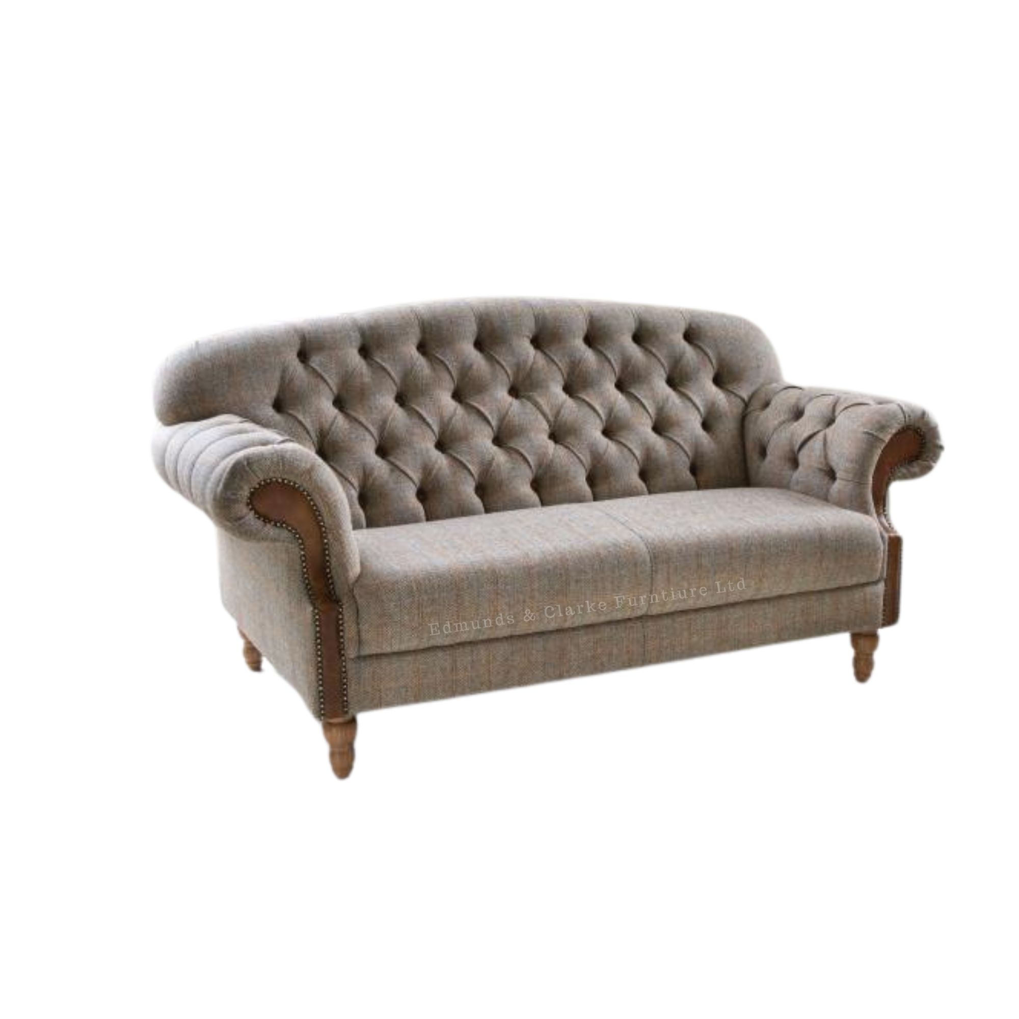 Our majestic “Haworth Tweed” sofa oozes class and sophistication with its deep buttons, hockey stick arms, chunky back, and rounded profile. Based on the Chesterfield design that has been beautifully made with aniline “Italian leather” and of course the ultimate fabric – genuine HARRIS TWEED.