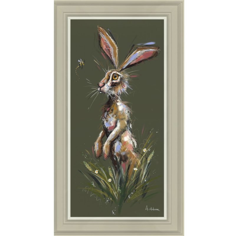 This artwork features a fun hare, rendered with a dynamic mix of green hues to complement the frame, loose brushwork, and energetic splatters that give a sense of a playful look. This inquisitive hare’s quirky personality shines through!