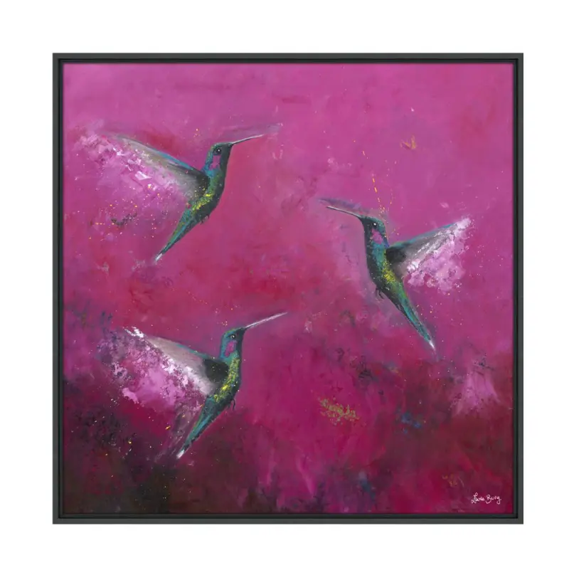 The Joy of Hummingbirds is a framed canvas piece by Laure Bury. This artwork will definitely add a pop of fun and colour to your walls. Three hummingbirds fluttering in the air together along with a fuchsia pink background – it is a real stand out piece. The canvas also has Diamond Dust which gives it a sparkle in the light much like the shimmering feathers of a Hummingbird. All complemented by a thin black frame.