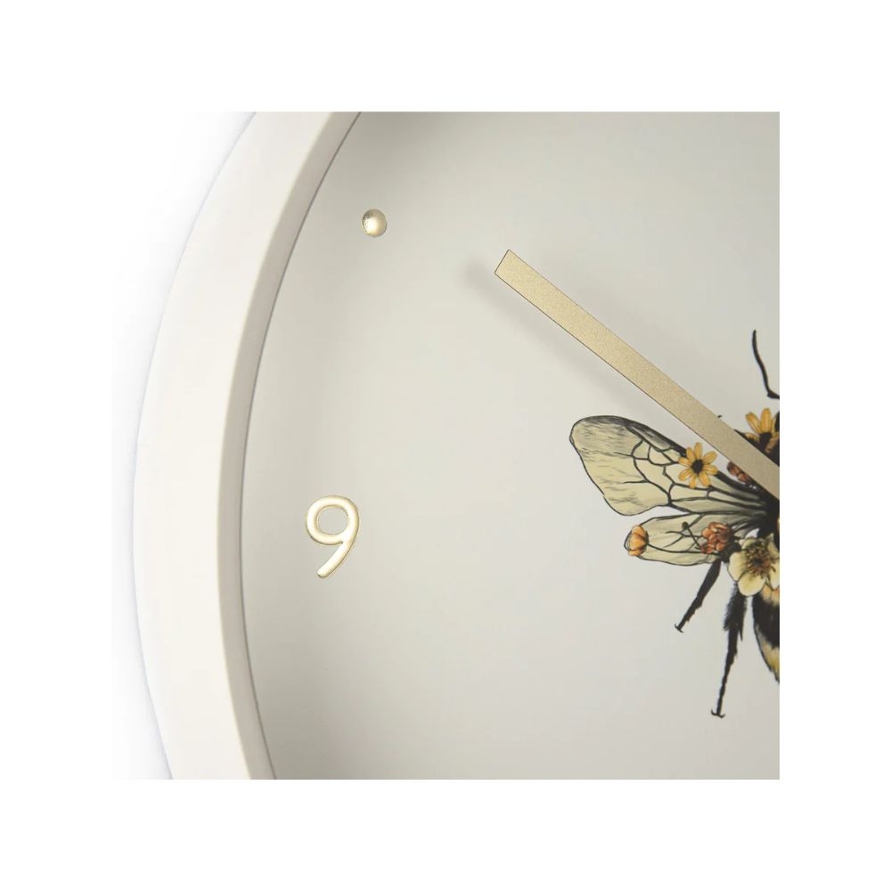Our Bee in bloom wall clock is a super stylish wall clock. Featuring a deep chalk white frame with gold clock hands and gold ticks that complements this friendly bee.